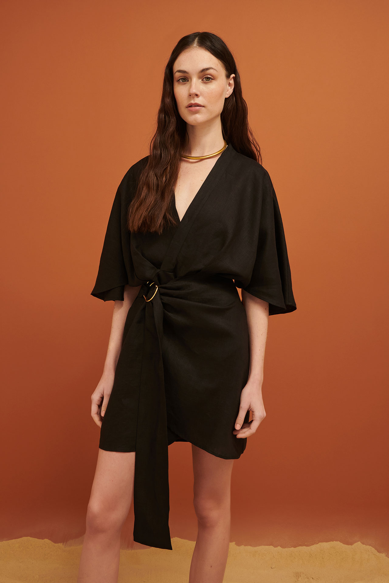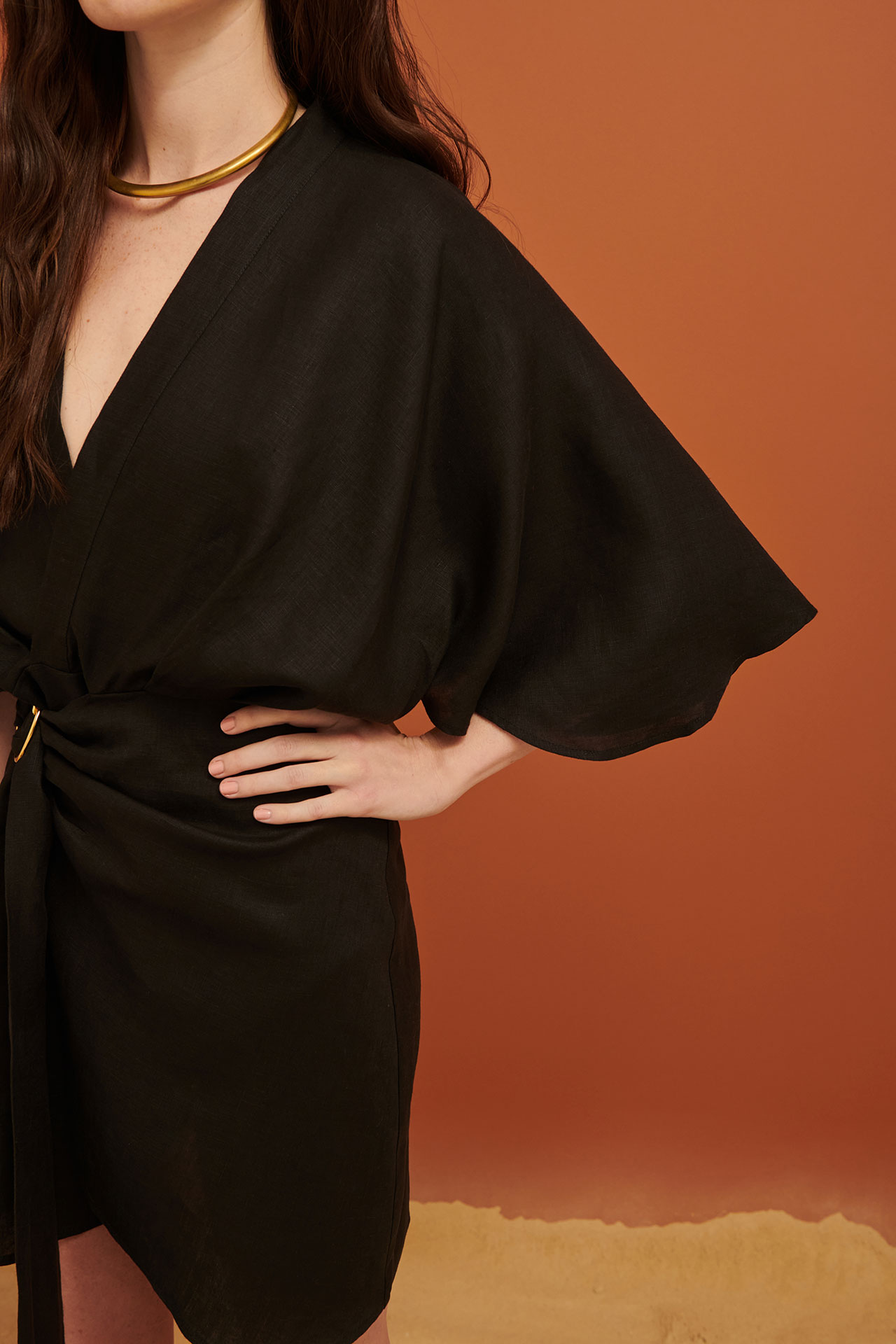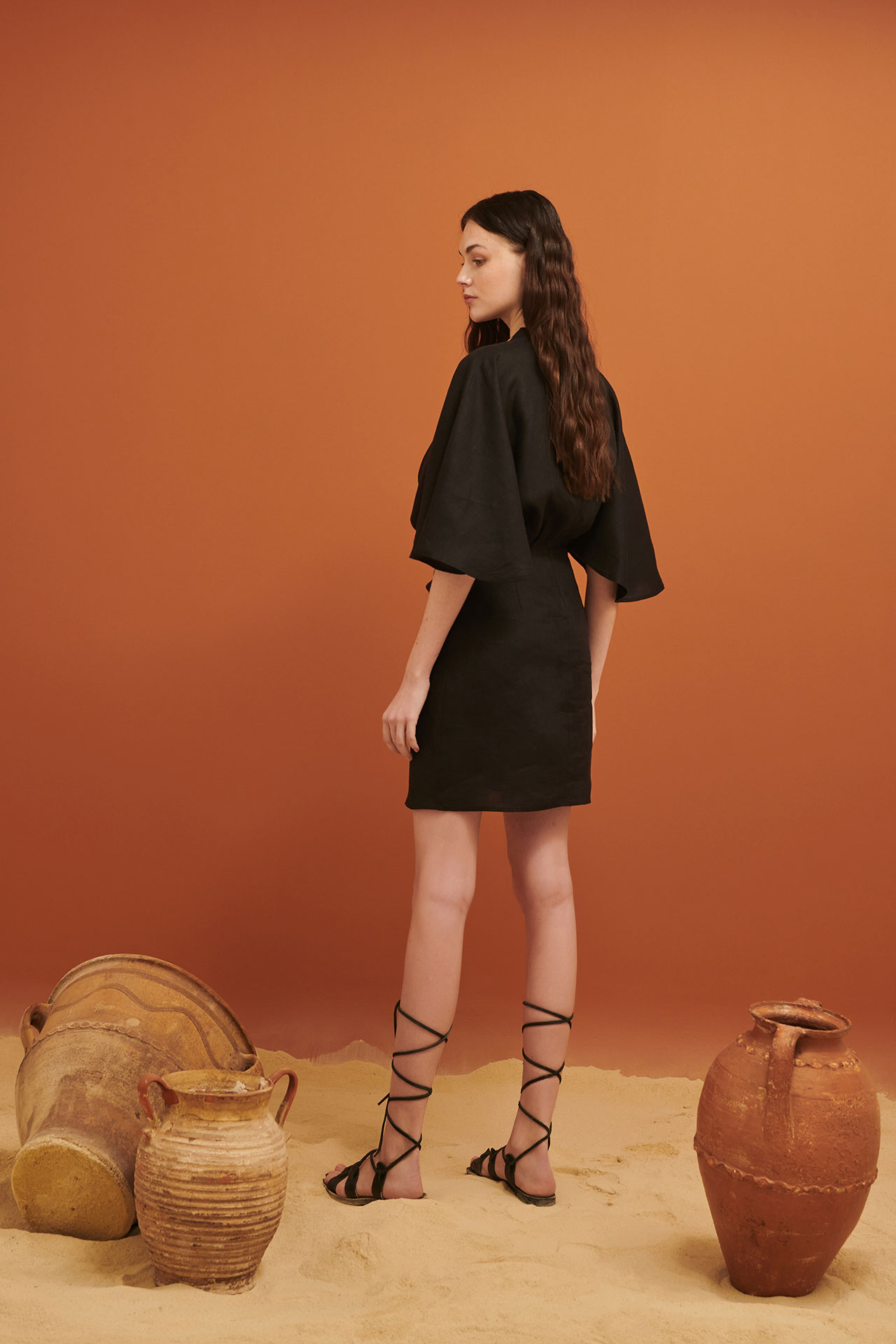 Linen short dress with a wrap V-neckline. Short ruffled,wide sleeves. Self-tie detail at the side of the skirt decorated with gold rings. Invisible zip fastening at the back of skirt. Deep slit along the back decorated with buttons. Styled for a normal fit. Produced in Greece.